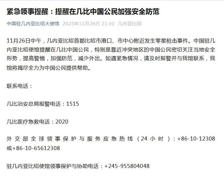 11月26日中午正规配资平台app,几内亚比绍首都比绍市港口、市中心附近发生零星枪击事件。中国驻几内亚比绍使馆提醒在几比中国公民,特别是靠近冲突地区的中国公民密切关注当地安全形势,提高警惕,加强防范,减少外出。如遇紧急情况,请及时报警并与我馆联系,我馆将竭尽全力为中国公民提供帮助。